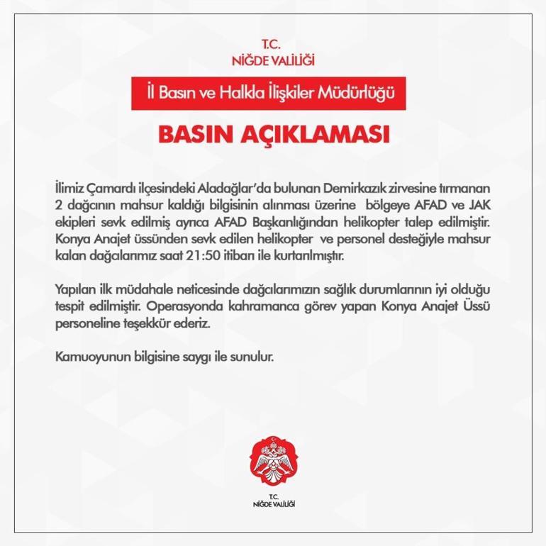 Aladağlar Demirkazık zirve ve Çağıl mevkisinde 2 dağcının mahsur kaldığı bilgisi üzerine bölgeye AFAD, JAK ve sağlık ekipleri sevk edildi. Konya 3. Ana Jet Üs Komutanlığı’ndan sevk edilen helikopterle Demirkazık mevkisine tırmanan 2 dağcı kurtarıldı. Niğde Valiliği’nden yapılan açıklamada yapılan kontrollerde dağcıların sağlık durumlarının iyi olduğu belirtildi.