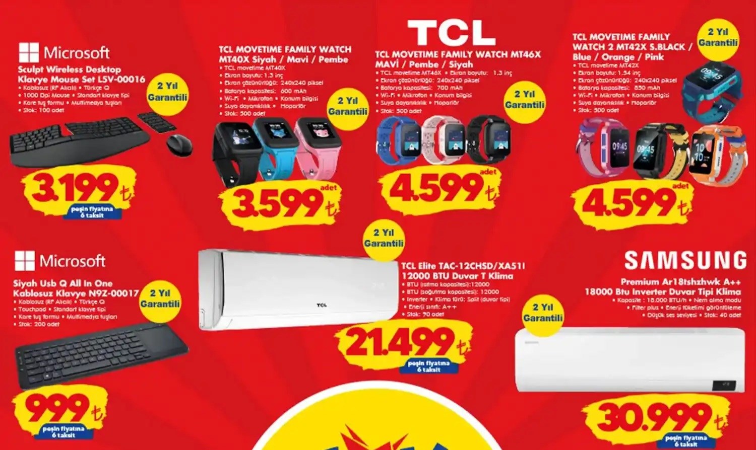 ŞOK marketlerin hafta içi kampanyasında TCL Movetime markasına ait çeşitli çocuk akıllı saatleri, Microsoft markasına ait kablosuz klavye ve fare setleri, robot süpürgeler, hava temizleyiciler ve klimalar yer alıyor.
