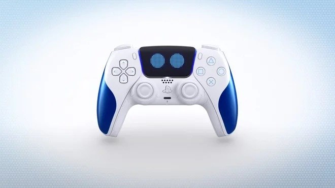 PlayStation’ın DualSense kablosuz kontrol cihazının özel sürümü, Astro’nun kendisiyle aynı renkte beyaz bir taban, tutamaklarda ve düğmelerde mavi vurgularla yenilendi. Dokunmatik yüzey, Astro’nun yüzünü taklit eden bir çift göz içeriyor.