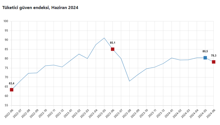 Türkiye İstatistik Kurumu ve Türkiye Cumhuriyet Merkez Bankası işbirliği ile yürütülen tüketici eğilim anketi sonuçlarından hesaplanan tüketici güven endeksi, Mayıs ayında 80,51 iken Haziran ayında %2,7 oranında azalarak 78,3 oldu.