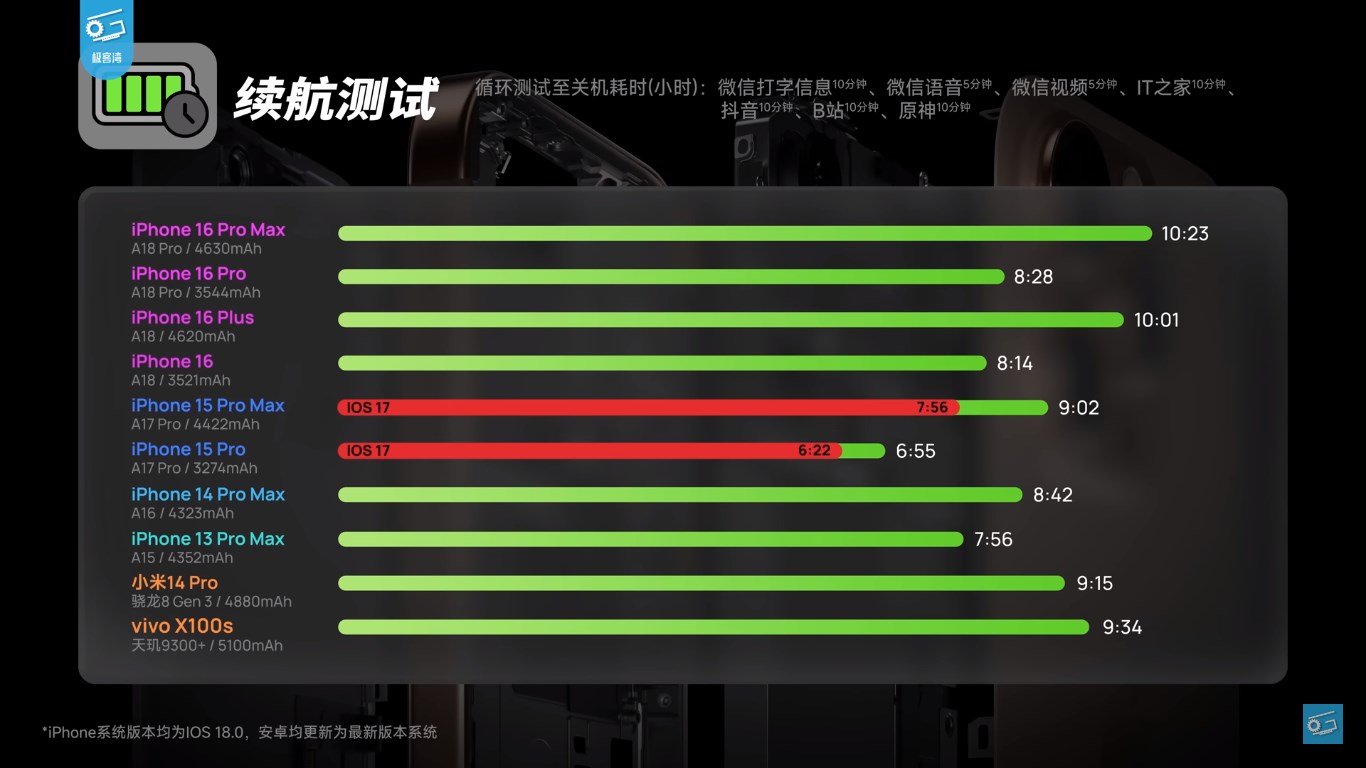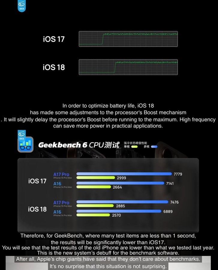 Youtube’daki Geekerwan kanalının bulgularına göre, iOS 18 ile beraber işlemci bir yük altına girdiğinde artık daha geç yüksek frekansa çıkıyor. Bu sayede pil ömründe artış elde ediliyor. Ancak bu gecikme nedeniyle Geekbench 6 skorlarında bir miktar düşüş yaşanıyor.