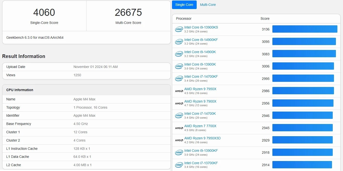 Sızdırılan Geekbench tablosuna baktığımızda ise, M4 Max’in tek çekirdekte 4.060 puan, çoklu çekirdekte ise 26.675 puana sahip olduğunu görüyoruz. Bu da Geekbench 6’nın tek çekirdek sıralamasında rekor niteliğinde. Kıyaslamak adına, M3 Max’in tek çekirdekte 3.189 ila 3.200 arasında puana ulaştığını belirtelim. M4 Pro ise benzer testlerde sırasıyla 3.546 ve 21.866 puan alıyor.