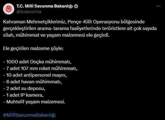 MSB’den yapılan açıklamada şu bilgiler paylaşıldı; Kahraman Mehmetçiklerimiz, Pençe-Kilit Operasyonu bölgesinde gerçekleştirilen arama-tarama faaliyetlerinde teröristlere ait çok sayıda silah, mühimmat ve yaşam malzemesi ele geçirdi.