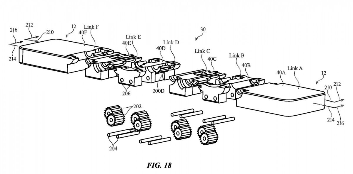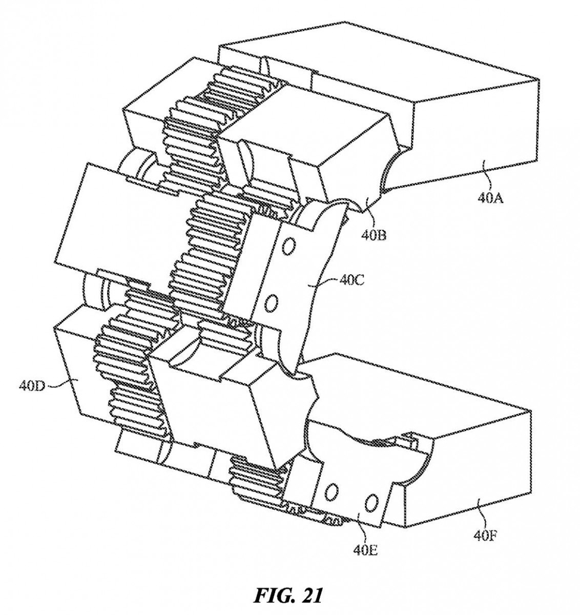 Apple’ın aldığı patent, birbirine bağlı birçok parça ve dişliden oluşan karmaşık bir menteşe tasarımını gösteriyor. Patentteki en ilgin ayrıntı hilal şeklindeki parçalar. Bu parçalar sayesinde, her bir bağlantı diğerine göre hareket ederek, dönüş eksenini bağlantını dışına taşıyabiliyor. Böylece daha yumuşak bir kıvrılma hareketi elde ediliyor.