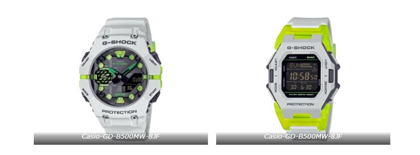 GD-B500MW-8JF modeli, karbon yapı yerine daha sade bir tasarımı tercih ederken, adım sayar özelliğiyle spor takibine odaklanıyor. Akıllı telefonlarla senkronize olan bu özellik, fitness aktivitelerini destekliyor. Büyük boyutlu negatif LCD ekranı, koleksiyonun genel hatlarıyla uyumlu olarak yüksek bir okunabilirlik sağlıyor. Her iki modelde de dünya saatleri, 1/100 saniye hassasiyetinde kronometre ve birden fazla günlük alarm gibi G-Shock’un temel özellikleri korunuyor.
