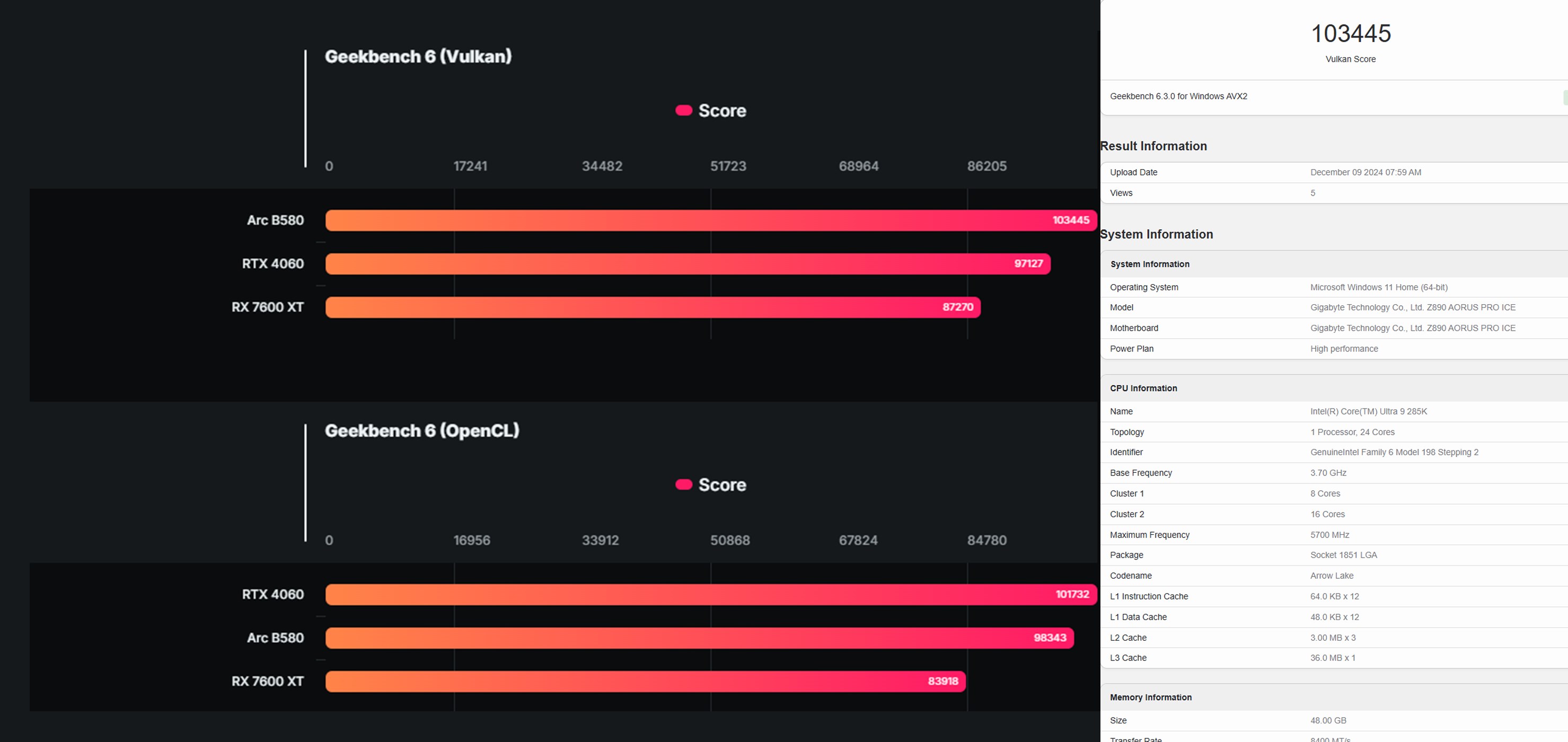 Daha önce Intel, Arc B580’e ait kıyaslama sonuçlarını zaten paylaştı ve bu sonuçlar ışın izleme rakamları dahil oyun ve çeşitli uygulamaları kapsıyordu. Yeni sızıntıda ise, ekran kartının 48 GB DDR5-8400 belleğe sahip Intel Core Ultra 9 285K sistemde test edildiğini görüyoruz.
