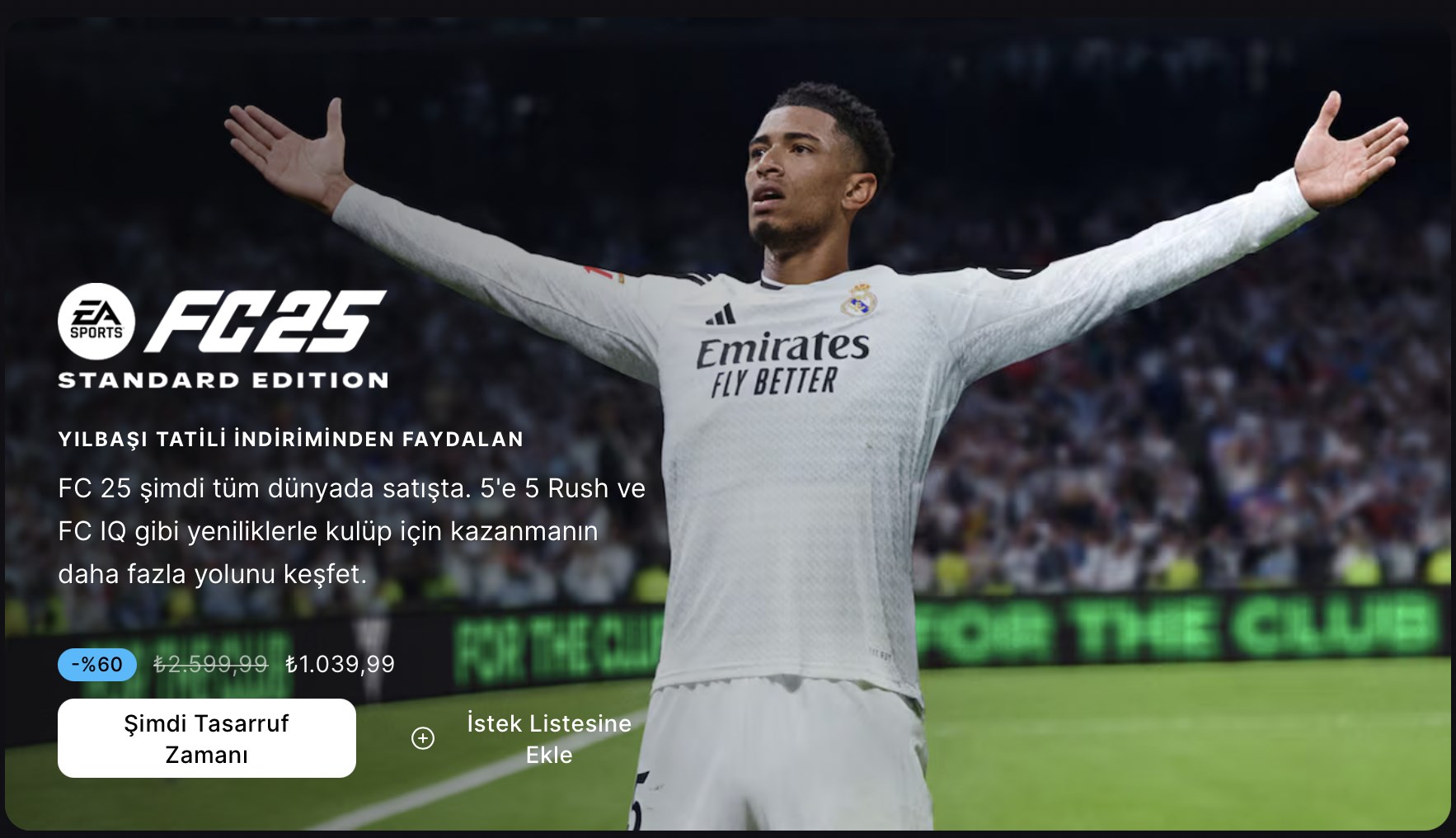 Eski adıyla FIFA yeni adıyla EA FC’nin son oyunu EA FC 25 indirime girdi. 70 dolar fiyat etiketi ile çıkışını yapan FC 25’in PC fiyatı 1.000 TL’nin altına indi. Kasım’da yüzde 50 indirime giren oyuna şimdi yüzde 60 indirim yapılıyor.