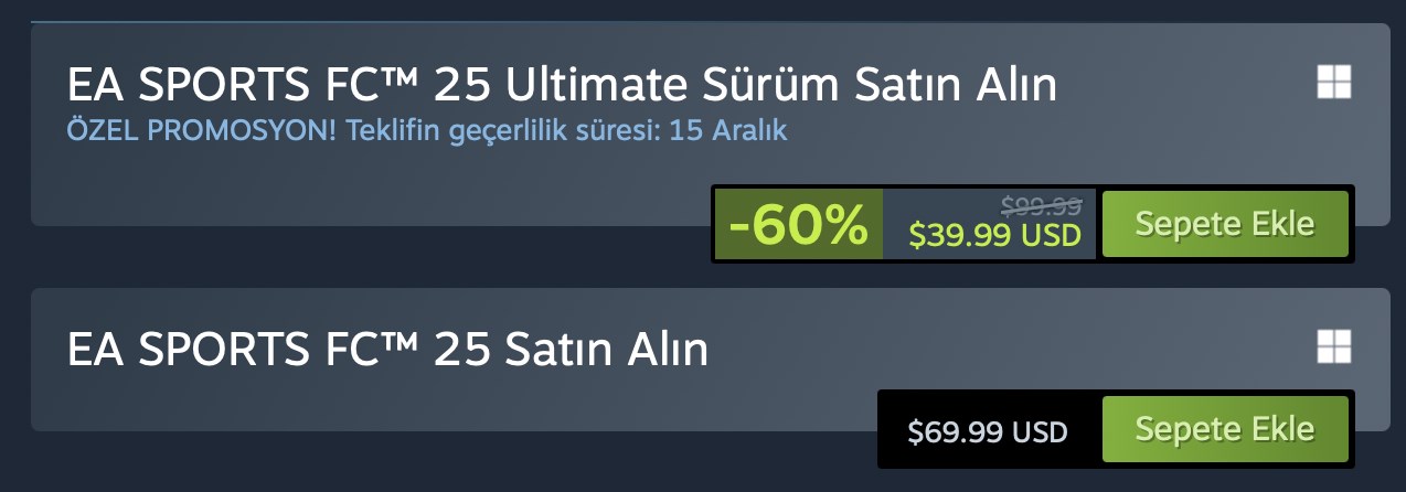Epic Store’da ise FC 25 Standart Sürümü yüzde 60 indirimle 1.039 TL’ye düştü. Bu indirim 9 Ocak saat 19.00’a kadar devam edecek. Ultimate sürüm Steam’de yüzde 60 indirimli