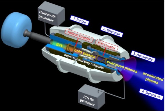 Ad Astra’nın üzerinde 20 yılı aşkın süredir çalıştığı VASIMR, elektrikli bir itki sistemi olarak öne çıkıyor. Bu sistem, plazmayı manyetik alanlarla hızlandırarak itme gücü sağlıyor. İyon iticiler gibi elektrikli itki sistemleriyle benzerlik taşısa da, VASIMR çok daha büyük enerji gereksinimlerine sahip.