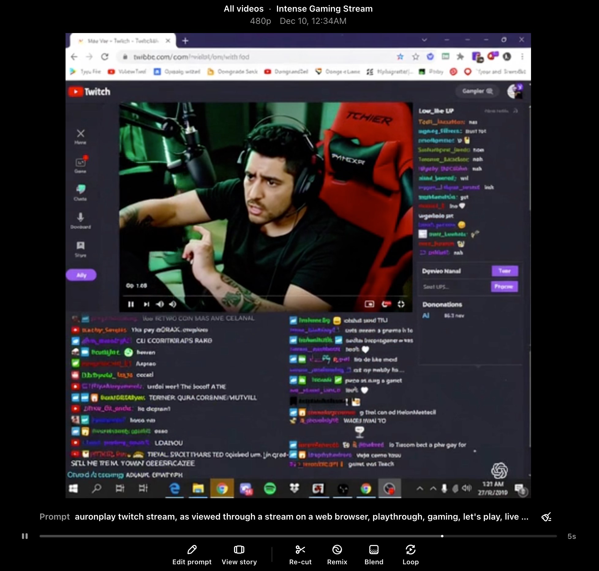 Elbette Sora’nın yaptıkları bunlarla sınırlı değil. Sora, Twitch arayüzüne çok benzeyen videolar da üretebiliyor. Aslında bu, Sora’nın Twitch üzerinde eğitildiğinin somut bir göstergesi; zira yapay zeka modelleri, eğitildikleri veriler üzerinden çıktı sağlıyor. Hatta öyle ki Auronplay adıyla tanınan popüler Twitch yayıncısının kolundaki dövmeyi bile Sora videolarında kullanıyor…