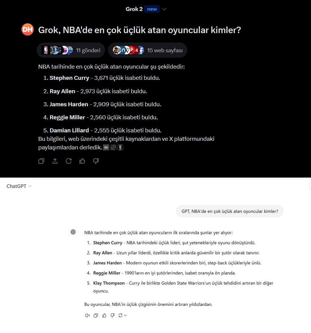 Ancak şu an bu chatbot’lardan hiçbiri tam olarak güncel bilgiye erişemiyor. Örneğin ChatGPT ve Grok’a “NBA’de en çok üçlük atan oyuncular kimler” gibi basit bir soru sorulduğunda bile her ikisi de yanlış cevap veriyor. James Harden, kasım ayı sonunda ikinci sıraya yükselmiş olsa da her ikisi de Harden’ı hâlâ Ray Allen’ın altında gösteriyor. Ancak ikisi arasında Grok’un en azından güncele daha yakın bir sonuç verdiği görülüyor.