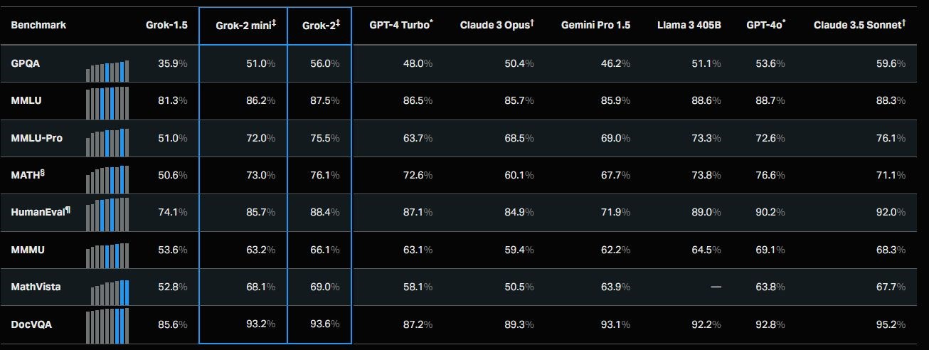 Grok-2 performans testlerinde hem GPt-4 Turbo’yu, hem de Claude 3.5 Sonnet’yi geçiyor. ChatGPT-4o’nun ise hemen arkasında yer alıyor. xAI’ın yapay zekası, hem belgelerden yola çıkarak soruları cevaplamada hem de görsel tabanlı görevlerde benzer botlardan daha iyi sonuçlar elde ediyor. HumanEval, GSM8k, MMLU, MATH gibi performans testleri, bir yapay zeka programının doğal dili ne denli anladığını, problem çözme becerisini ve tutarlı cevaplar verme kabiliyetini ölçüyorlar.
