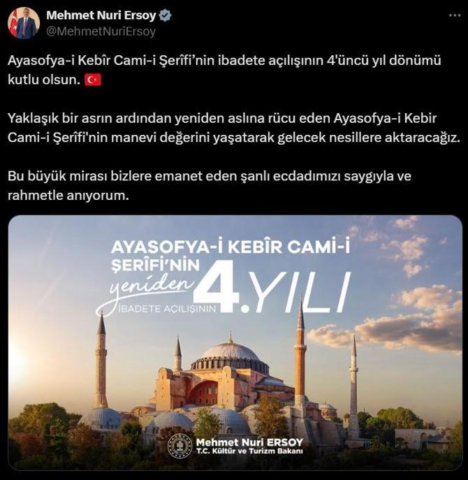 Bakan Ersoy, yaptığı paylaşımda, “Ayasofya-i Kebir Cami-i Şerifi’nin ibadete açılışının 4’üncü yıl dönümü kutlu olsun. Yaklaşık bir asrın ardından yeniden aslına rücu eden Ayasofya-i Kebir Cami-i Şerifi’nin manevi değerini yaşatarak gelecek nesillere aktaracağız. Bu büyük mirası bizlere emanet eden şanlı ecdadımızı saygıyla ve rahmetle anıyorum.” dedi.
