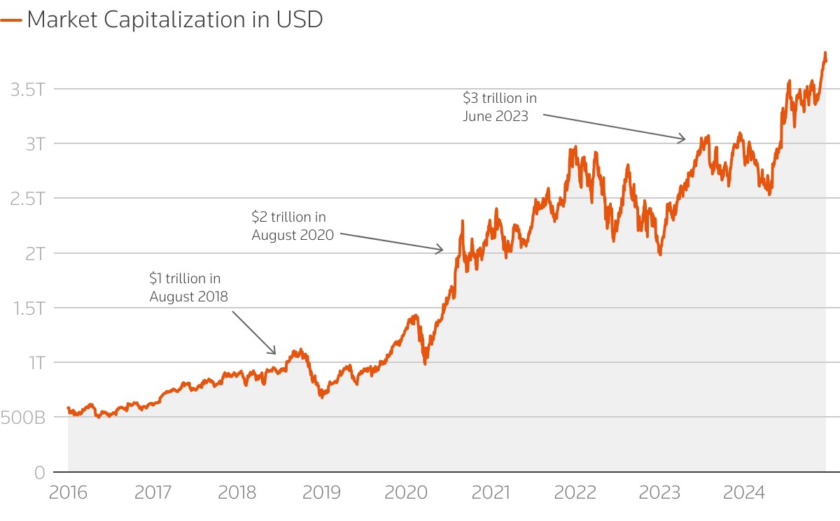 Teknoloji devi Apple, tarihin ilk 4 trilyon dolarlık piyasa değerine ulaşan şirketi olmaya bir adım daha yaklaştı. Şirketin hisseleri, Kasım ayı başından bu yana yüzde 16 artış göstererek yaklaşık 500 milyar dolarlık bir değer kazandı ve bu sayede toplam piyasa değeri 3,85 trilyon dolar seviyesine ulaştı.