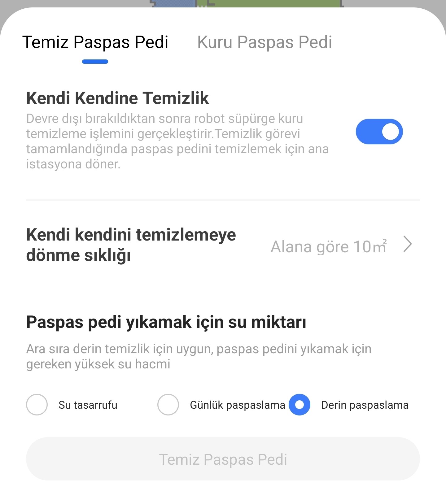 “Kendi kendini temizleme” menüsünde paspas pedini temizleme sıklığı, pedi yıkamak için kullanacağı su miktarını ve otomatik kurutma ayarını yapabiliyorsunuz. Otomatik kurutma süresi olarak 2 saat, 3 saat ve 4 saat şeklinde üç ayrı seçenek sunuluyor.