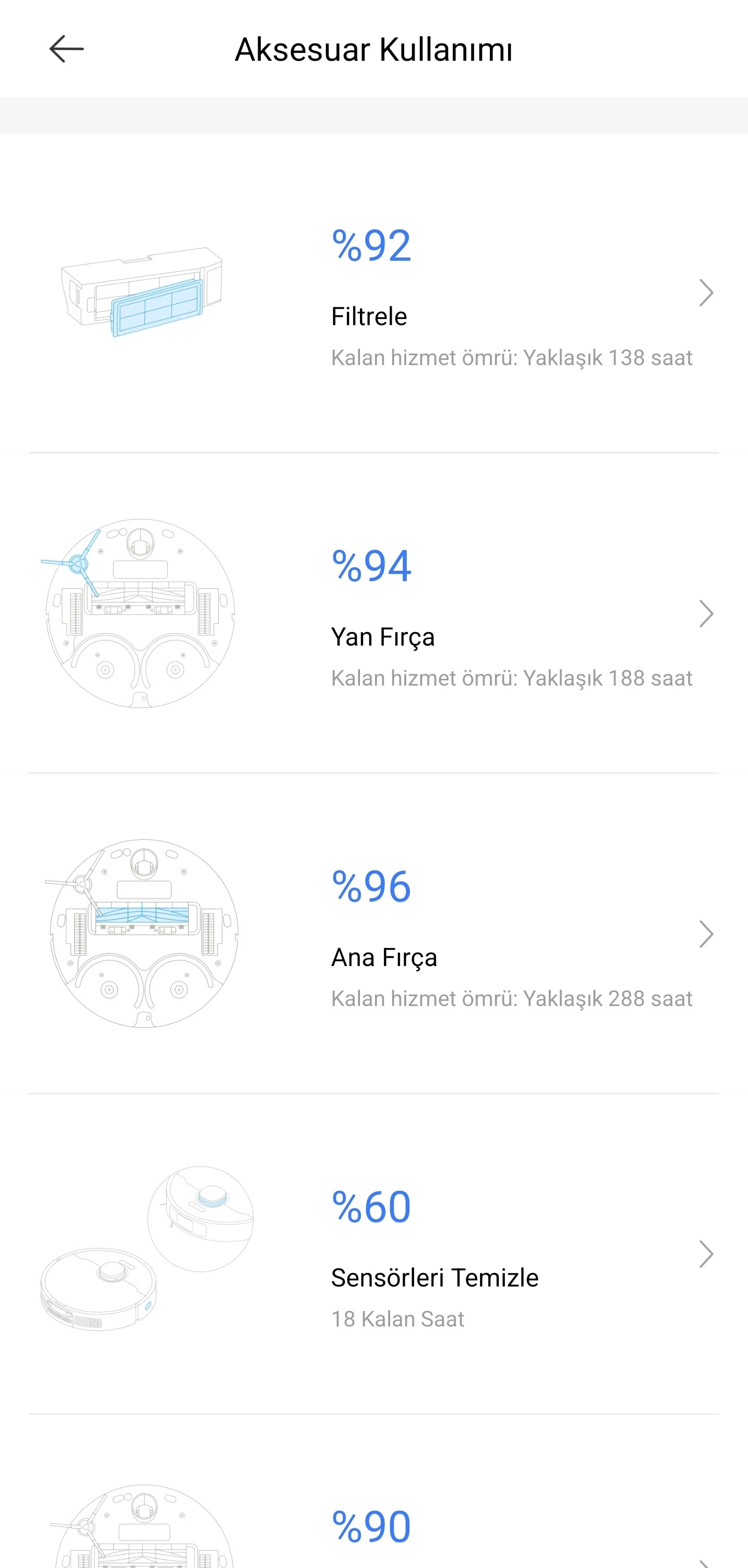 Dreamehome uygulamasının “Aksesuar Kullanımı” sayfasında süpürgenin bileşenlerinin ne kadar kullanıldığını ve ne kadar ömrünün kaldığını görebilirsiniz. Sensör temizliği, filtre temizliği ve paspas temizliği için sizi bilgilendiriyor. “Temizlik geçmişi” menüsünde son temizlik süresini ve kaç metrekare alanı temizlediğini görebilirsiniz.