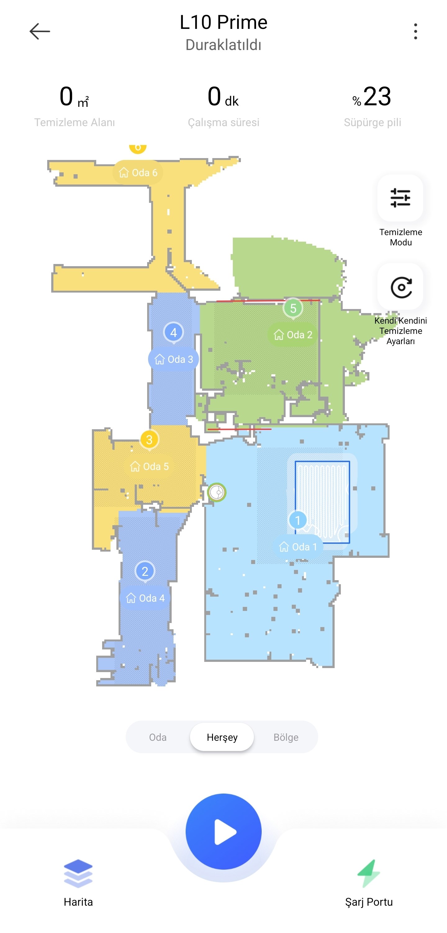 Uygulamaya giriş yaptıktan sonra süpürge üzerindeki karekod ile eşleştirme yapıyoruz. İlk olarak evi haritalandırmak için hızlı bir tur atıyor. Sonrasında temizlik modlarını seçerek temizliği başlatıyoruz.