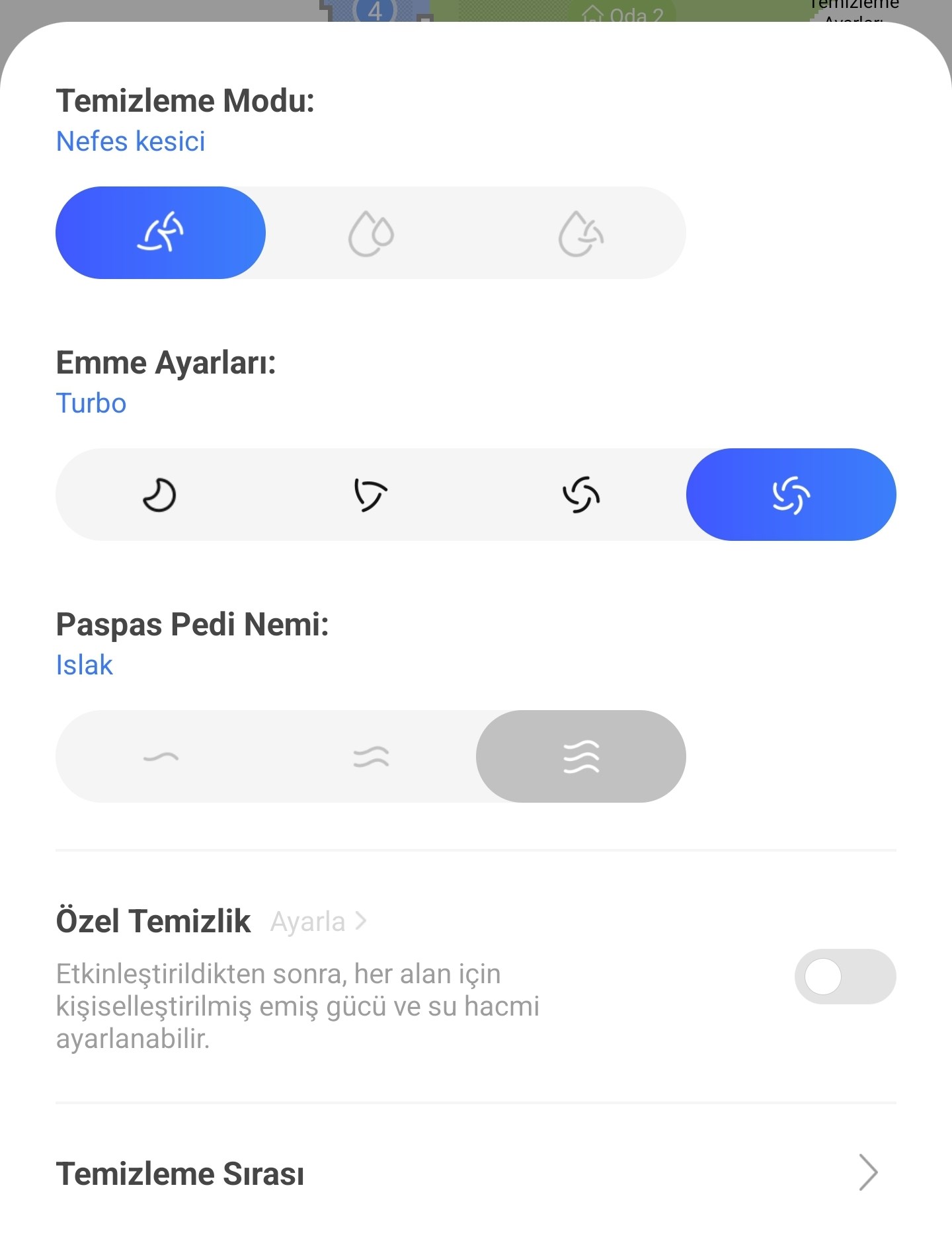“Sadece süpürme”, “Sadece paspaslama” ve “Süpürme ve Paspaslama” şeklinde üç ayrı mod ile temizlik yapılabiliyor. Emiş gücü ayarı için 4 farklı seviye, paspas ıslaklığı için 3 farklı seviye seçeneği sunuluyor. Dilerseniz evinizdeki her oda için ayrı mod belirleyebiliyorsunuz.