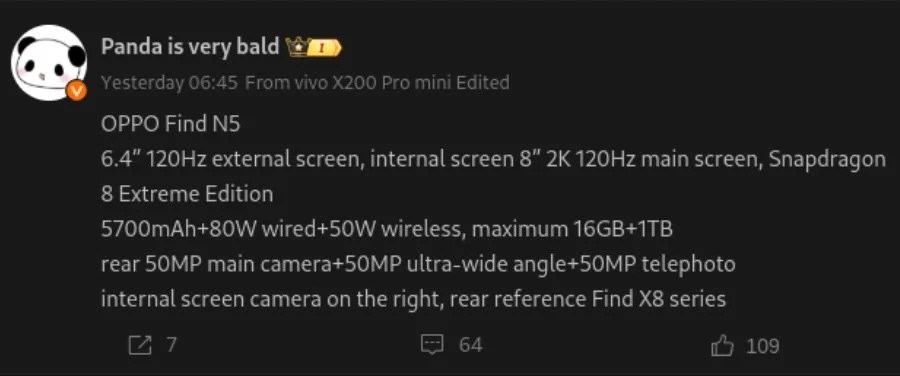 Oppo Find N5 özellikleri sızdırıldı: İşte merakla beklenen katlanabilir telefonun detayları