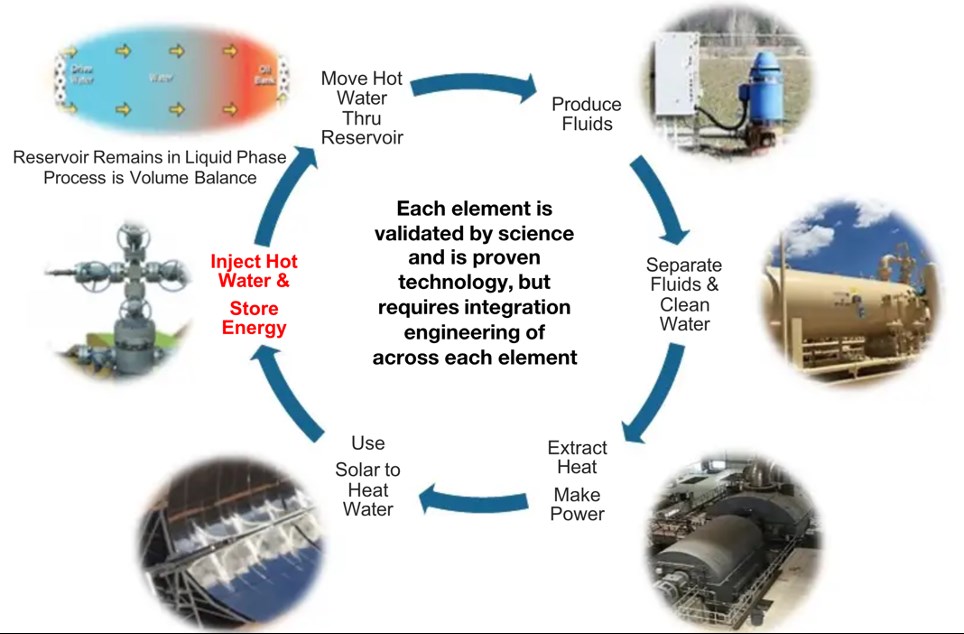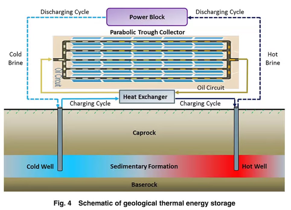 Bu şekilde ne dev depolara, ne dev kulelere, ne de devamlı güneşi takip eden dev aynalara ihtiyaç duyulmuyor. Parabolik yani yarım ay şeklinde olan güneş ısısı toplayıcılar ile 370 °C’a kadar ısıtmak ve eski bir sahadaki enjeksiyon kuyusundan göndermek yeterli. Toprağın altı bu yüksek sıcaklıktaki su sonrası 160 °C’a kadar yükseliyor ve gerektiğinde üretim kuyusundan enerji çekiliyor ve bundan elektrik üretiliyor. Bu sistemde verilen elektrik ile alınan elektrik enerjisi arasındaki fark %43 olsa bile elektriği saklamanın maliyeti sadece 0,11 dolar cent. Kısaca çok elektrik kaybediliyor ama başlangıç yatırımı çok düşük olduğu için sistem hayatı boyunca görece kimyasal bataryalara göre ucuz kalıyor.