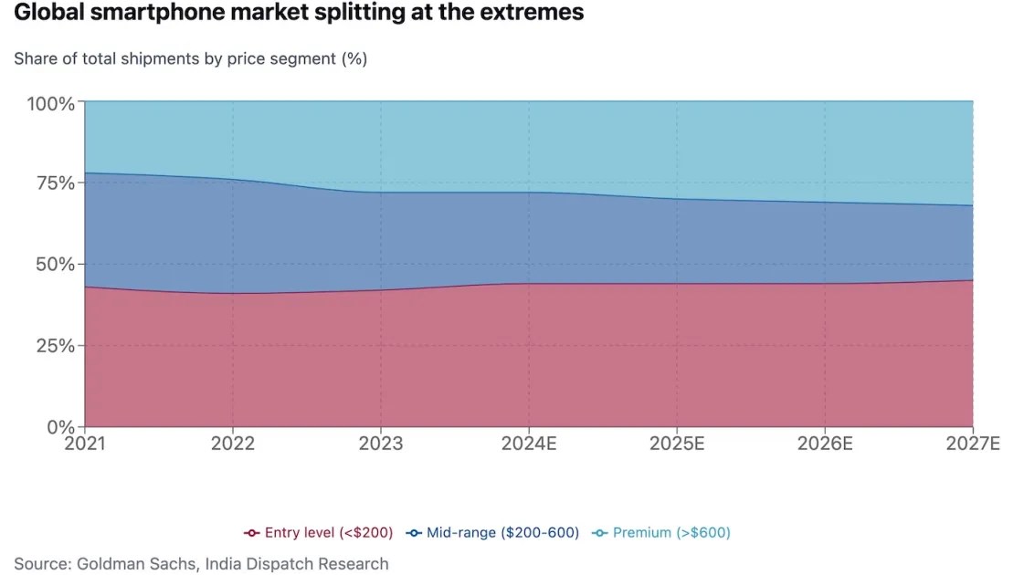 Dünya çapındaki akıllı telefon pazarında önemli bir dönüşüm yaşanıyor. Goldman Sachs tarafından derlenen verilere dayanan bir analiz, yakın vadede büyük değişimler yaşanacağını ortaya koyuyor. Aktarılanlara göre küresel akıllı telefon pazarı lüks ve ucuz olmak üzere iki ayrı segmente ayrılıyor; orta seviye akıllı telefon pazarı ise çöküyor.