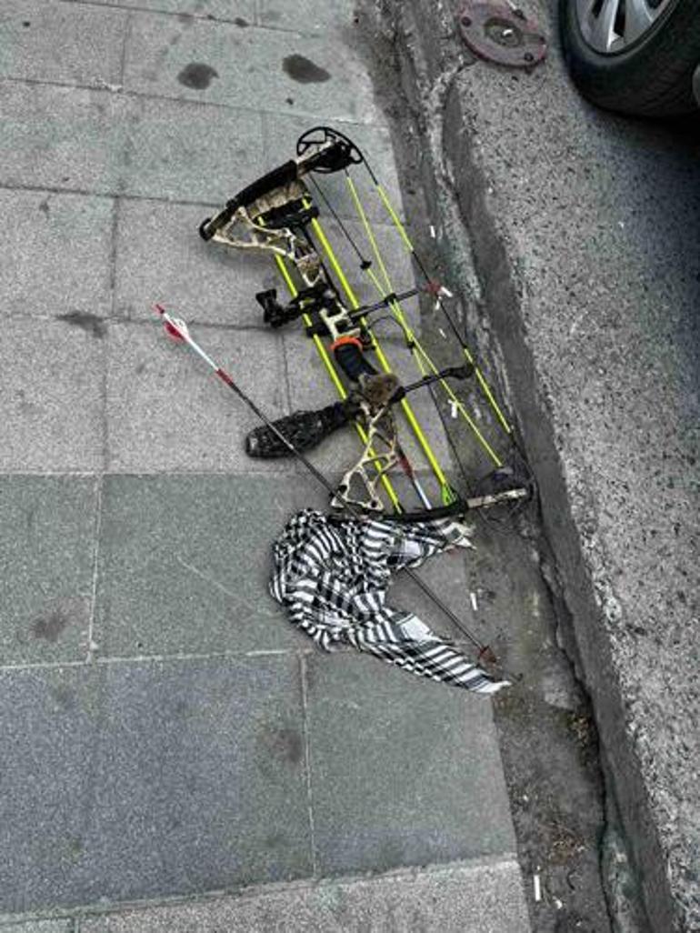 Güvenlik kamerasına yansıyan görüntülerde saldırganın omzuna astığı yay ve belindeki oklarla camiye doğru yürüdüğü görülüyor.