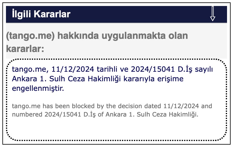 Canlı yayın ve sosyal medya platformu Tango’ya erişim engeli getirildi. Tango mobil uygulaması ve tango.me alan adı, Ankara 1. Sulh Ceza Hakimliğinin 11 Aralık 2024 tarihli ve 2024/15041 sayılı kararıyla erişime engellendi.