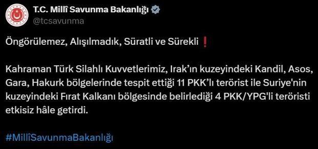 MSB’den yapılan açıklamada, ‘Öngörülemez, Alışılmadık, Süratli ve Sürekli! Kahraman Türk Silahlı Kuvvetlerimiz, Irak’ın kuzeyindeki Kandil, Asos, Gara, Hakurk bölgelerinde tespit ettiği 11 PKK’lı terörist ile Suriye’nin kuzeyindeki Fırat Kalkanı bölgesinde belirlediği 4 PKK/YPG’li teröristi etkisiz hâle getirdi.’ denildi.