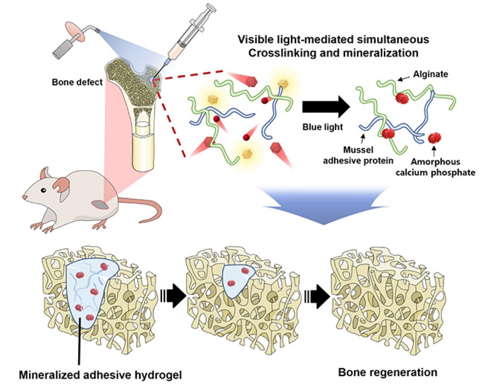 POSTECH (Pohang Bilim ve Teknoloji Üniversitesi) tarafından geliştirilen bu hidrojel malzeme, alglerden elde edilen aljinat, biyomühendislik ürünü midye yapıştırıcı proteini, kalsiyum iyonları ve fotoreaktif bir bilesen gibi bırçok özel bileşen içeriyor. Hidrojel, enjekte edildiği bölgede zararsız bir ışık kaynağı ile uyarıldığında, polimer zincirlerinin birbirleriyle çapraz bağlanmasıyla gözenekli bir katı maddeye dönüşüyor. Bu malzeme, biyolojik olarak kolayca parçalanabilir özelliği sayesinde hem mekanik dayanıklılık sağlıyor hem de yakın dokulardan gelen kemik hücrelerinin içine göç ederek yeni kemik oluşumunu hızlandırmasına olanak tanıyor.