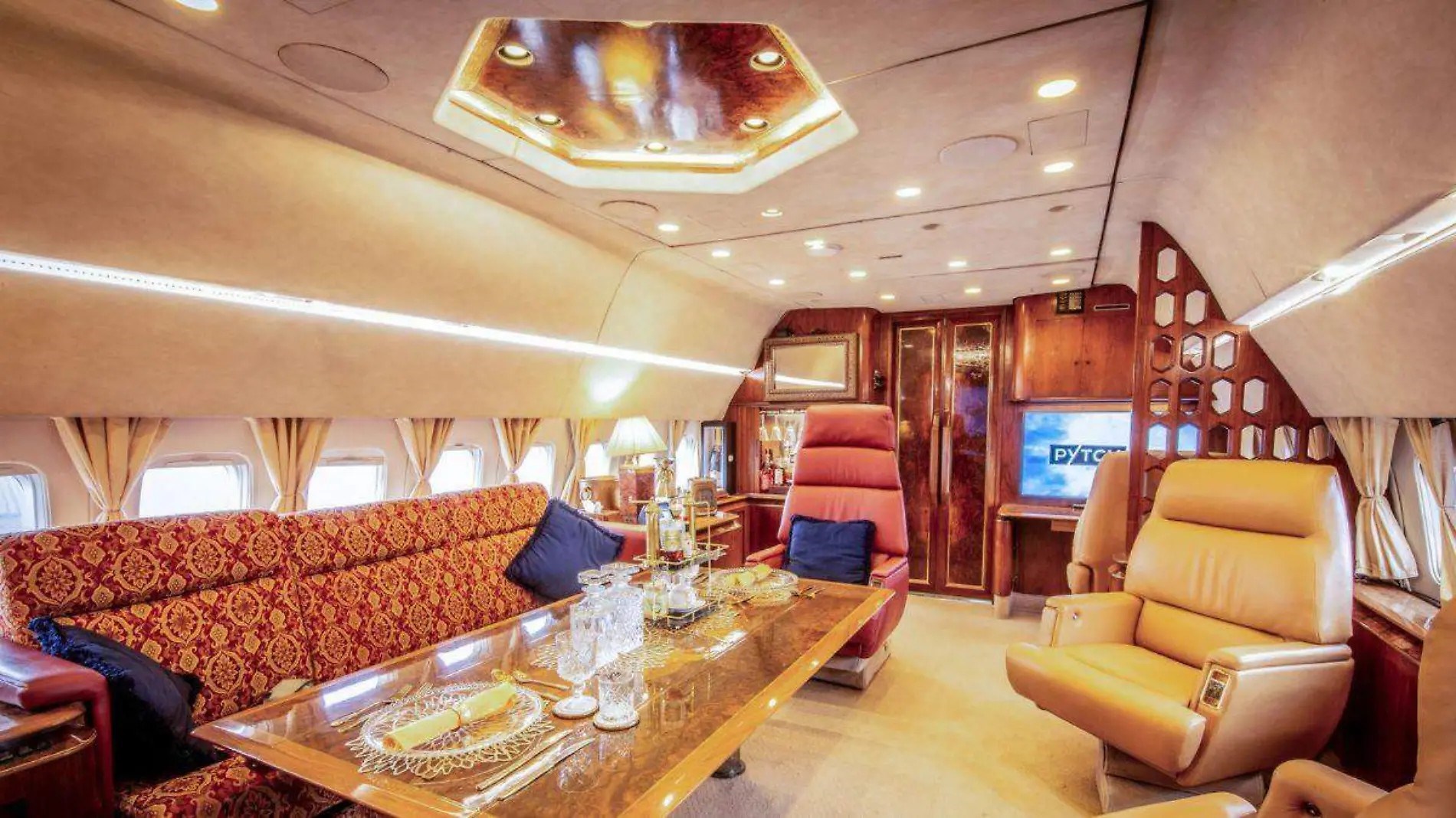 Uçakta her biri kendi tuvalet ve banyosuna sahip iki çift kişilik yatak odası var. Ceviz ağacından oturma grubu, deri koltuklar ve yaldızlı detaylar gibi unsurlarla süslenmiş bir oturma alanı bulunuyor. Misafirleri adeta lüksün doruklarına çıkartmak amacıyla tasarlandığı söylenebilir. Bununla birlikte orijinal kokpit gibi detaylar, ziyaretçilere deyim yerindeyse bir zaman yolculuğu yaşatıyor.