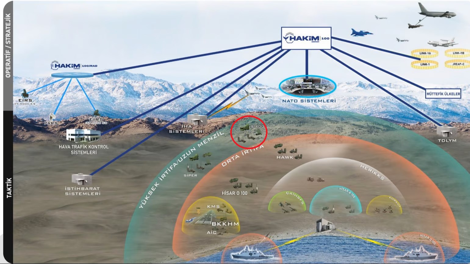 HAKİM 100 sistemi, ASELSAN tarafından geliştirilen, kısa, orta ve uzun menzilli hava savunma sistemlerini NATO ve uluslararası standartlarla uyumlu bir şekilde entegre eden bir komuta ve kontrol platformu. Sistem, farklı radarlar ve sensörlerden gelen gerçek zamanlı verileri işleyerek kapsamlı bir hava resmi oluşturuyor. Bu da komutanlara durumsal farkındalık sağlarken, tehdit değerlendirme ve silah tahsis algoritmalarıyla etkili savunma stratejileri geliştirilmesine olanak tanıyor. S-400’ün HAKİM 100’e entegre edilmesi durumunda, bu sistemin Türk yapımı uzun menzilli hava savunma sistemi SİPER ile aynı operasyonel katmanda çalışacağı öne sürülüyor. Ancak ASELSAN’ın sitesindeki mevcut broşürde S-400’ler yer almıyor.