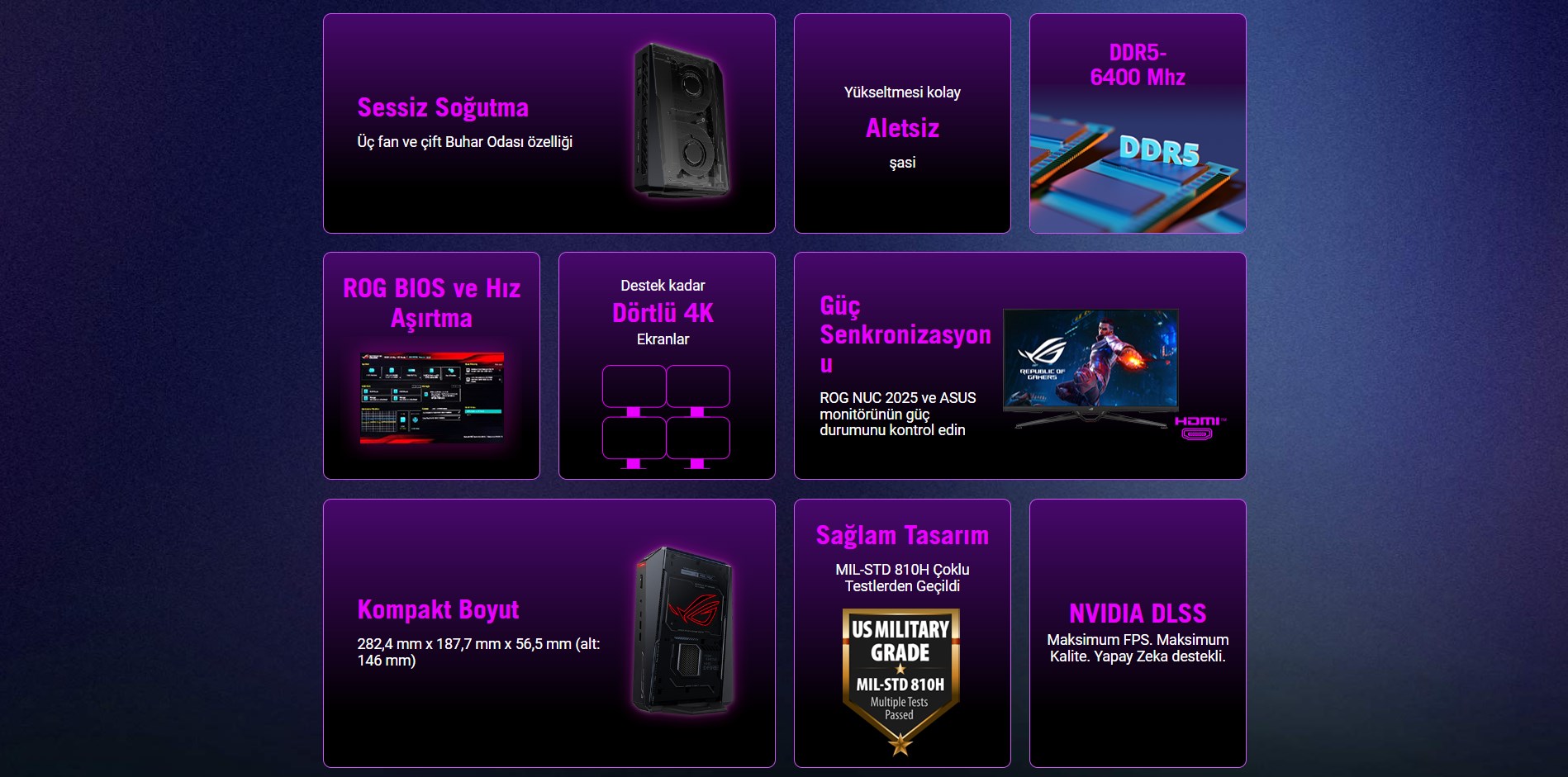 ROG NUC 2025, termal verimlilik adına üç fan ve çift buhar odası özelliği ile destekleniyor. Ayrıca askeri dayanıklılık odaklı MIL-STD 810H sertifikasına sahip olduğunu söyleyelim. Üstelik bu konfigürasyonun yanında kullanıcıların bellek ve depolama bileşenlerini hızlıca değiştirme olanağı sunan modüler bir kasa tasarımı tercih edilmiş.