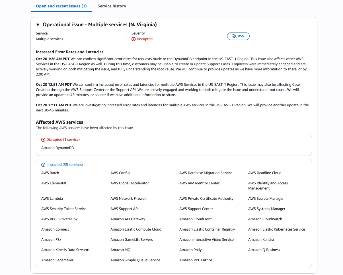 AWS’nin kontrol paneli, kesintiyi TSİ 10:11’de ilk olarak US-EAST-1 Bölgesi için rapor etti. Amazon, TSİ 10:51’de yayımladığı güncellemede, sorunu hem hafifletmek hem de kök nedenini anlamak için aktif olarak çalıştıklarını belirtti ve “45 dakika içinde veya paylaşacak ek bilgimiz olursa daha erken bir zamanda bir güncelleme yapacağız” dedi. Kesinti, hem bireysel kullanıcıları hem de AWS altyapısına bağlı kurumsal uygulamaları ciddi şekilde etkiledi. Kaynak : https://www.donanimhaber.com/snapchat-epic-ve-playstation-network-e-erisim-sorunu-yasaniyor–197512