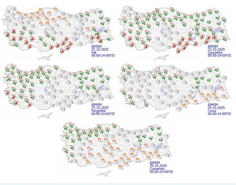 Haftanın ikinci yarısında ise yağışlar yurdu terk ediyor. Cumartesi’den itibaren tüm bölgelerde hava açacak ve sıcaklıklar yeniden yükselecek. 26 ve 27 Ekim’de Türkiye genelinde güneşli ve ılıman bir hava bekleniyor. Yağışların sona ermesiyle birlikte batı ve güney kesimlerde sıcaklıklar 25 dereceyi bulacak, soğuk hava ve kar yalnızca yüksek bölgelerde etkisini sürdürecek.