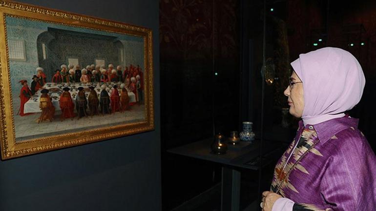 Müzedeki “Masada Bir Yer: İslam Dünyasında Sofra, Yemek ve Ziyafet Geleneği” sergisini gezen Emine Erdoğan, eserler hakkında bilgi aldı.