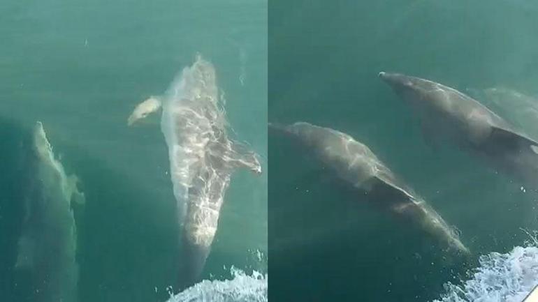 Teknenin yanında yüzmeye başlayan yunuslar, güzel görüntüler oluşturdu. Bir süre tekne ile birlikte suda ilerleyen yunuslar, daha sonra gözden kayboldu.