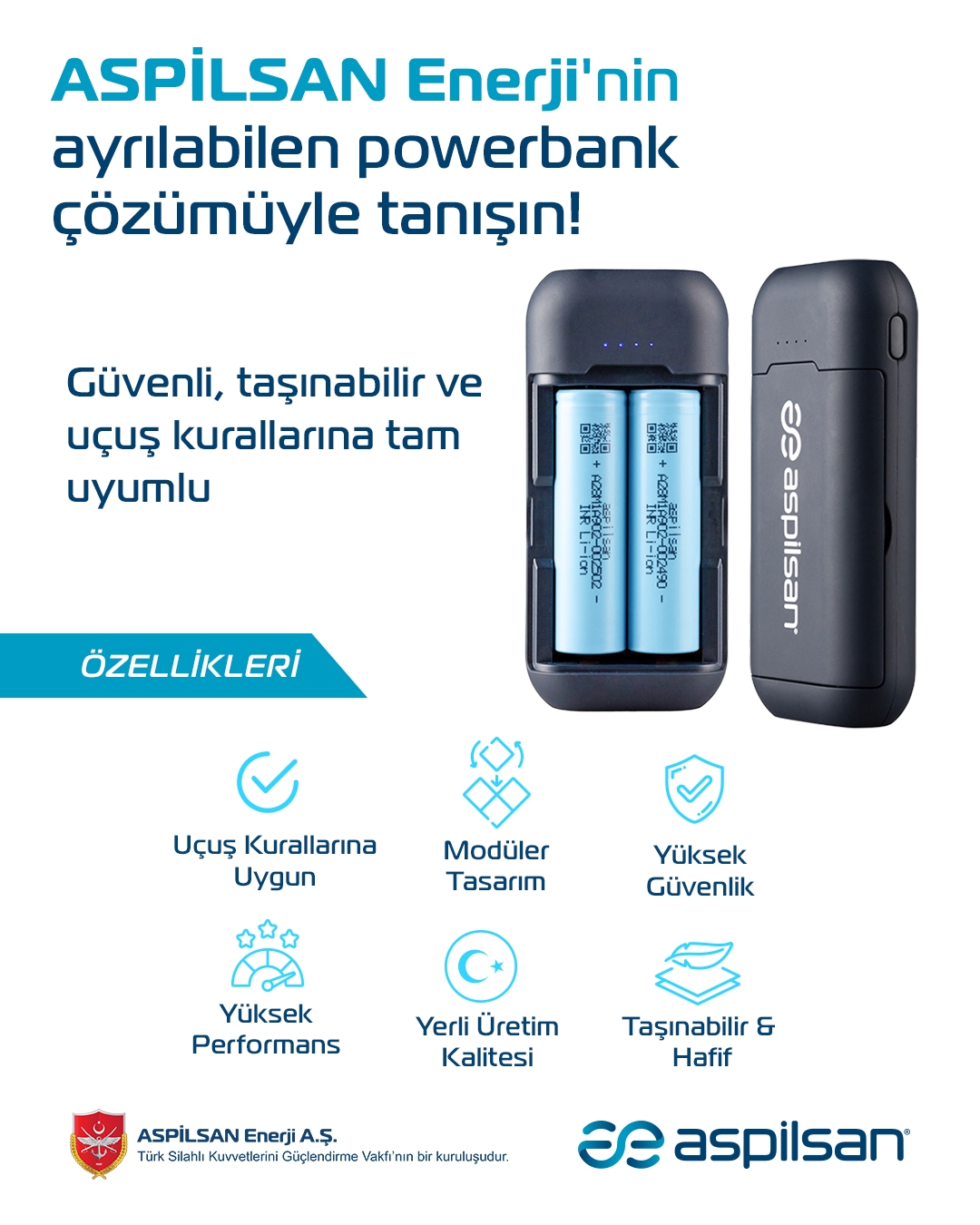 Türk Silahlı Kuvvetlerini Güçlendirme Vakfı’nın bir kuruluşu olan ASPİLSAN Enerji, sık seyahat edenler için pili çıkarılabilir Powerbank geliştirdiğini duyurdu. Uluslararası uçak seyahatlerinde son dönemlerde lityum bataryası çıkmayan bagajlar uçaklara kabul edilmiyor. ASPİLSAN Enerji tarafından geliştirilen pilleri çıkarılabilen Powerbank teknolojisi, uçuş kurallarına tam uyum gösteriyor.