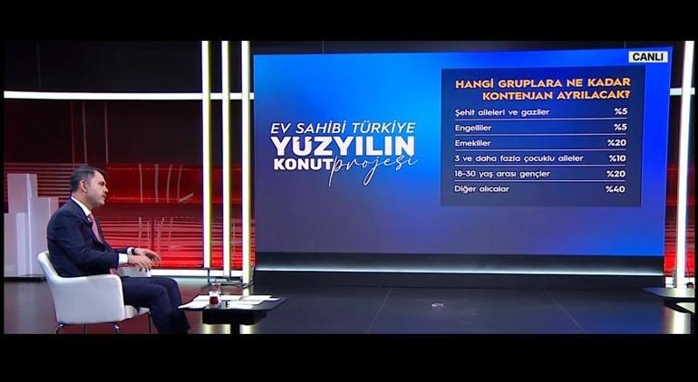 Çevre, Şehircilik ve İklim Değişikliği Bakanı Murat Kurum, Yüzyılın Konut Kampanyası’nın detaylarını CNN TÜRK’te açıkladı. Bakan Kurum’un açıklamalarından satır başları şu şekilde: Cumhuriyet tarihimizin en büyük sosyal konut projesini duyurduk. Ev Sahibi Türkiye projesini milletimize armağan ettik. Çok büyük bir proje tabii. 81 ilde hem konut fiyatları hem de kira fiyatlarını düşürmek amacıyla yaptığımız bir proje. İstanbul’da 100 bin konutu vatandaşlarımıza sunuyor olacağız. Evi olmayan vatandaşımızın ev sahibi olabilmesi için büyük bir proje. Ev sahibi olmayan her Türkiye Cumhuriyeti vatandaşı bu projeye başvurabilir.