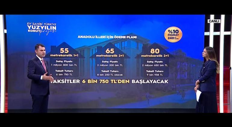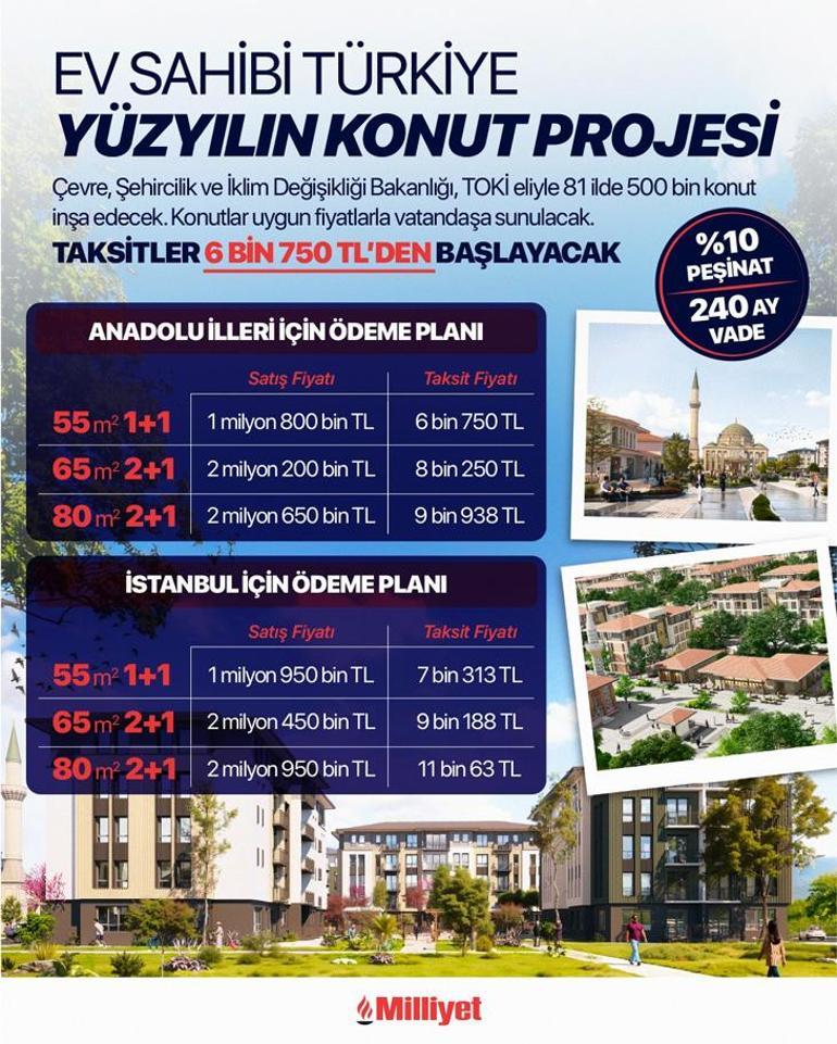Anadolu’da 55 metrekarelik 1+1 evlerimizi 1 milyon 800 bin TL’den satışa sunuyoruz. Taksit tutarı 6 bin 750 TL. 65 metrekarelik 2+1 evlerimizi 2 milyon 200 bin TL’den satışa sunuyoruz. Taksit tutarı 8 bin 250 TL olacak. 80 metrekarelik 2+1 evlerimizi 2 milyon 650 bin TL’den satışa sunuyoruz. Taksit tutarı 9 bin 938 TL olacak. Yüzde 10 peşinat ve 240 ay vade ile satışa sunuyoruz. Vatandaşımız kira değil aidat öder gibi ev sahibi olabilecek.