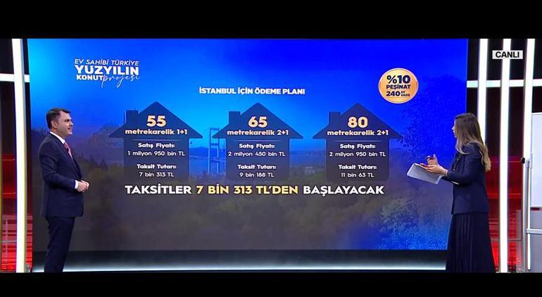 İstanbul’da 55 metrekarelik 1+1 evlerimizi 1 milyon 950 bin TL’den satışa sunuyoruz. Taksit tutarı 7 bin 313 TL. 65 metrekarelik 2+1 evlerimizi 2 milyon 450 bin TL’den satışa sunuyoruz. Taksit tutarı 9 bin 188 TL olacak. 80 metrekarelik 2+1 evlerimizi 2 milyon 950 bin TL’den satışa sunuyoruz. Taksit tutarı 11 bin 63 TL olacak.
