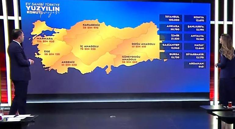 7 bölgeye ayırdık. Marmara Bölgesi’ne 156 bin 920, Ege’ye 58 bin 120, Akdeniz’e 61 bin 660, Karadeniz’e 38 bin 970, İç Anadolu’ya 78 bin 330, Doğu Anadolu’ya 41 bin 410 , Güneydoğu Anadolu’ya 58 bin 880 olmak üzere; İstanbul’a 100 bin, Ankara’ya 30.780, İzmir’e 21.520, Gaziantep’e 13.940, Bursa’ya 13.730, Konya’ya 13.670, Şanlıurfa’ya 13.190, Antalya’ya 13.160, Hatay’a 12.640, Diyarbakır’a 12.170, Ardahan’a 540 konut yapacağız.
