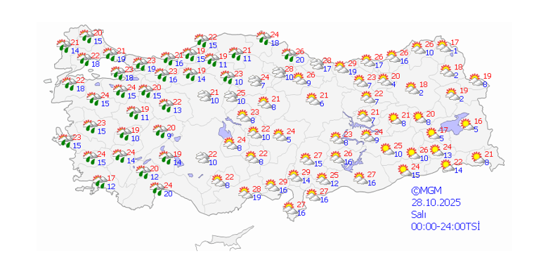 Mevsim normallerinin üzerinde seyreden hava sıcaklıkları hafta sonundan itibaren azalacak. Yurt genelinde hafta sonu yağışlı hava hakim olacak. Meteoroloji Genel Müdürlüğü tarafından yapılan tahminlere göre; bugün yurt genelinin parçalı yer yer çok bulutlu, Marmara’nın güney ve doğusu, Kıyı Ege, Karadeniz ile Ankara’nın kuzeyi, Hatay kıyıları, Sivas, Çankırı, Antalya, Adana, Osmaniye, Ardahan ve Kars çevrelerinde sağanak şeklinde, Doğu Karadeniz’in iç kesimlerinin yüksekleri ile Doğu Anadolu’nun kuzeydoğusunun yükseklerinin karla karışık yağmurlu geçeceği tahmin ediliyor.
