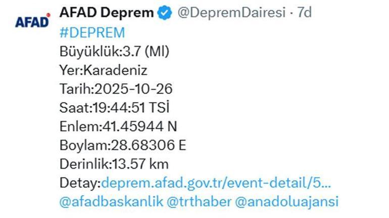 AFAD, merkez üssü Karadeniz olan depremin büyüklüğünü 3.7 olarak duyurdu. Saat 19.44’te meydana gelen deprem İstanbul’da da hissedildi.