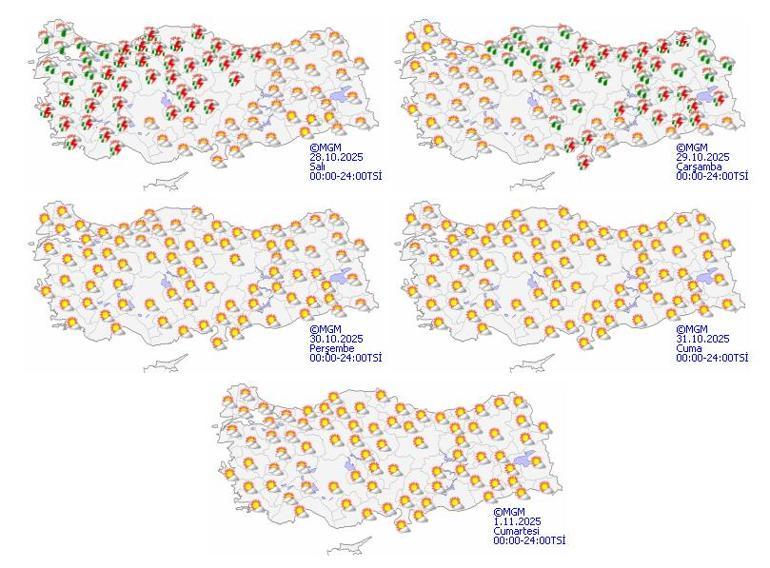 Meteoroloji Genel Müdürlüğü tarafından yapılan tahminlere göre; Ülkemiz genelinin parçalı, yer yer çok bulutlu, Marmara(Edirne hariç), Ege, Batı Akdeniz, İç Anadolu’nun kuzeybatısı ile Batı ve Orta Karadeniz’in sağanak ve gök gürültülü sağanak yağışlı geçeceği tahmin ediliyor. Yağışların; Marmara(Edirne hariç), Batı Karadeniz, Bursa, Bilecik, Muğla, İzmir, Manisa, Antalya’nın doğusu, Ankara’nın kuzey ve batısı ile Çankırı çevrelerinin yer yer kuvvetli olması bekleniyor. Rüzgarın; Marmara’nın kuzey kesimlerinde kuzeyli, Marmara’nın güney kesimleri, İç Ege, Batı ve Orta Karadeniz’in iç kesimleri ile İç Anadolu’da güney ve güneybatı yönlerden kuvvetli (40-60 km/sa) eseceği tahmin ediliyor.