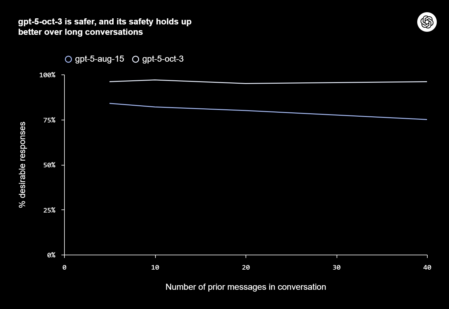 OpenAI, blog yazısında, yeni GPT-5 güncellemesinin istenmeyen davranışları azalttığını ve kullanıcı güvenliğini artırdığını duyurdu. Yapılan model değerlendirmesinde, 1.000’den fazla intihar ve kendine zarar verme içerikli konuşma incelendi. Şirket, yeni versiyonun, önceki versiyona göre ruh sağlığı sorunlarına yaklaşık yüzde 65 daha fazla “istenilen yanıtlar” sağladığını iddia ediyor. OpenAI’a göre, GPT-5’in yeni sürümü, istenen davranışlarla uyum açısından yüzde 91 oranında başarılıyken, önceki sürümde bu oran yüzde 77’ydi. Şirket, uzun sohbetlerde de yeni GPT-5’in OpenAI’ın güvenlik önlemlerine daha iyi uyum sağladığını ifade etti. Daha önce, uzun sohbetlerde güvenlik önlemlerinin etkisinin azaldığı belirtilmişti.