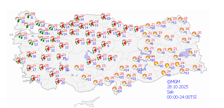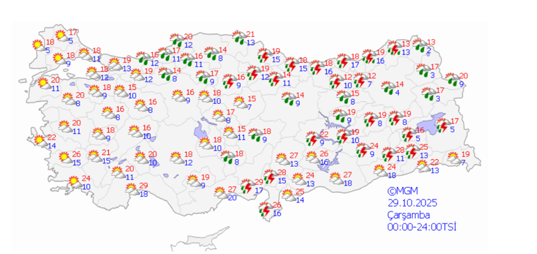 Meteoroloji Genel Müdürlüğü tarafından yapılan tahminlere göre ülke geneli parçalı, yer yer çok bulutlu, Marmara, Ege, Batı Akdeniz, İç Anadolu’nun kuzeyi, Karadeniz(Artvin hariç) ile Niğde, Kayseri, Nevşehir, Osmaniye çevreleri ile Adana’nın doğusunun sağanak ve gök gürültülü sağanak yağışlı geçeceği tahmin ediliyor.