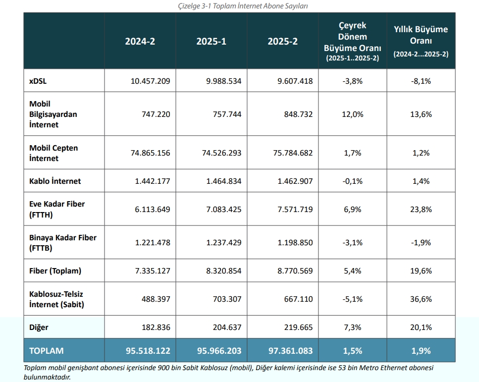 2025 yılı ikinci çeyreğinde Türkiye’de toplam genişbant internet abone sayısı 97,4 milyona ulaşarak bir önceki çeyreğe göre yüzde 1,5 oranında artış gösterdi. Sabit genişbant hizmetlerinde pazarın lideri ise TTNet oldu.