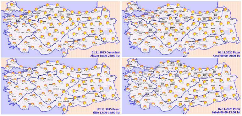 Meteoroloji Genel Müdürlüğü tarafından yapılan tahminlere göre: Ülkemiz genelinde yağış beklenmiyor. Yurdun iç ve batı kesimlerinin parçalı bulutlu, diğer yerlerin az bulutlu ve açık geçeceği tahmin ediliyor. Gece ve sabah saatlerinde Marmara, Ege’nin kuzey ve doğusu, İç Anadolu’nun kuzeybatısı ile Karadeniz’in iç kesimlerinde pus ve yer yer sis bekleniyor.