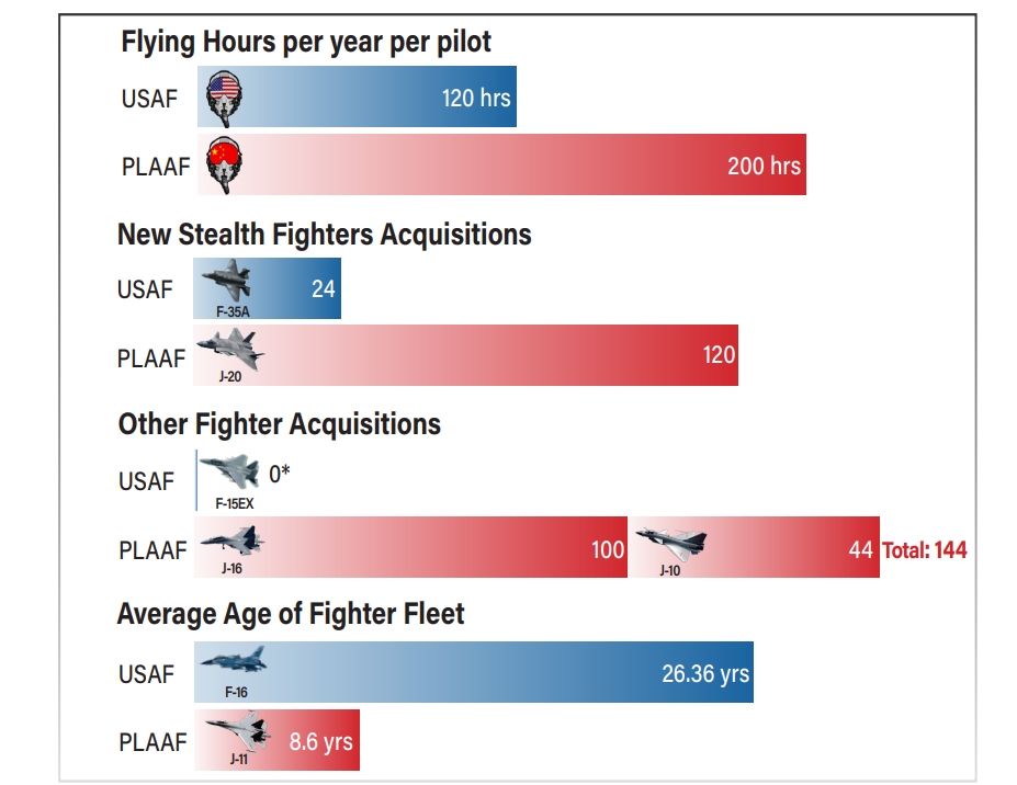 ABD ordusu uzun zamandır Hava Kuvvetleri filosunun yaşlanması ve küçülmesi konusunda kaygılı. Buna karşılık Çin, hem uçak sayısını hem de muharebe kabiliyetini hızla artırıyor. Her iki filo özellikle kapasite, yetenek ve hazırlık açısından karşılaştırıldığında “biz çok gerideyiz, vahim derecede gerideyiz” diyor Venable.