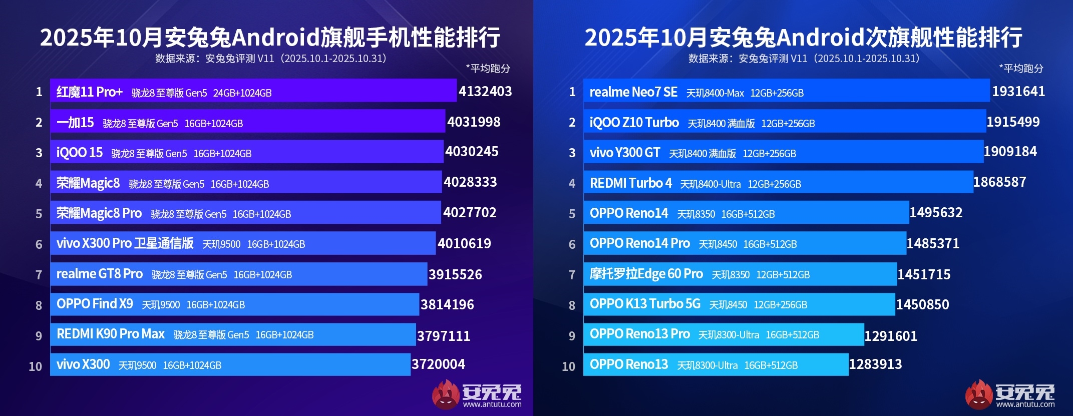 Akıllı telefon performans testleriyle tanınan AnTuTu, Ekim 2025’in en güçlü Android cihazlarını açıkladı. 1–31 Ekim tarihleri arasında toplanan verilere göre, Red Magic 11 Pro+ amiral gemisi sınıfında zirveye yerleşti. Peki, amiral gemisi ve orta segment telefonlar arasında hangi modeller öne çıktı? Gelin, Ekim ayının en güçlü Android telefonlarına birlikte bakalım.